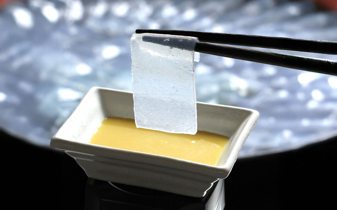 湯来の天然地下水はミネラルが豊富で、フジトシでは製造に必要な全工程でこの水を使用。また、使用する水はすべて酸素を抜く「脱気」をすることにより、気泡が入りにくく、滑らかでムラのない生地に仕上がりやすい工夫をしています。こんにゃくの9割を占める水分にまでこだわることで、自然で澄んだ、芋本来の色や香りを生かした味わいを実現しています。