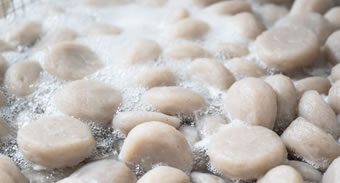 生芋をすりつぶして炊き上げた昔ながらの製法。味が染み込みやすく、弾力と風味が格別。