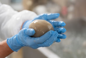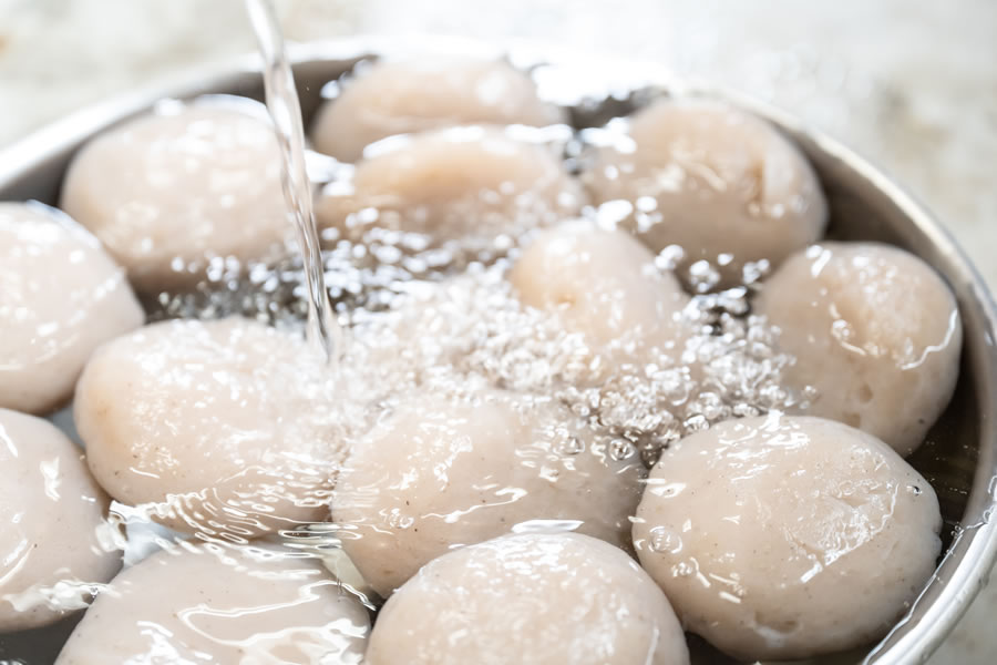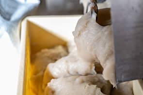 湯来の天然地下水はミネラルが豊富で、フジトシでは製造に必要な全工程でこの水を使用。また、使用する水はすべて空気を抜く「脱気」をすることにより、気泡が入りにくく、滑らかでムラのない生地に仕上がりやすい工夫をしています。こんにゃくの9割を占める水分にまでこだわることで、自然で澄んだ、芋本来の色や香りを生かした味わいを実現しています。