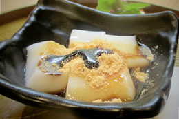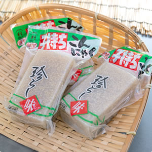 「こんにゃくミルク餅」湯来町に牧場を有するサゴタニ牛乳の牛乳を使用して作りあげたこんにゃくスイーツ「こんにゃくミルク餅」。こんにゃくのもっちりとした食感と牛乳のまろやかさが特長です。
